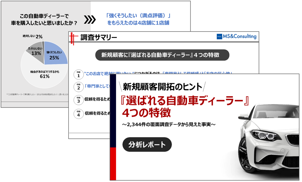 2,344件の覆面調査データから『お客様に選ばれる自動車ディーラー』に共通していた特徴を分析。販売力強化にお役立ていただけます。
